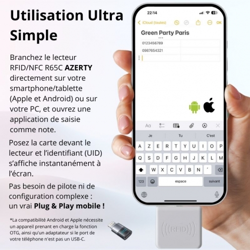 Termes associés : lecteur rfid, r65c, lecteur de carte, badgeuse rfid, lecteur nfc android, lecteur rfid iphone, lecteur nfc iphone, 13.56mhz, mifare, iso 14443a, nfc, android, apple, iphone, ipad, pc, usb, usb-c, otg, contrôle d'accès, identification, plug and play, sans contact, azerty